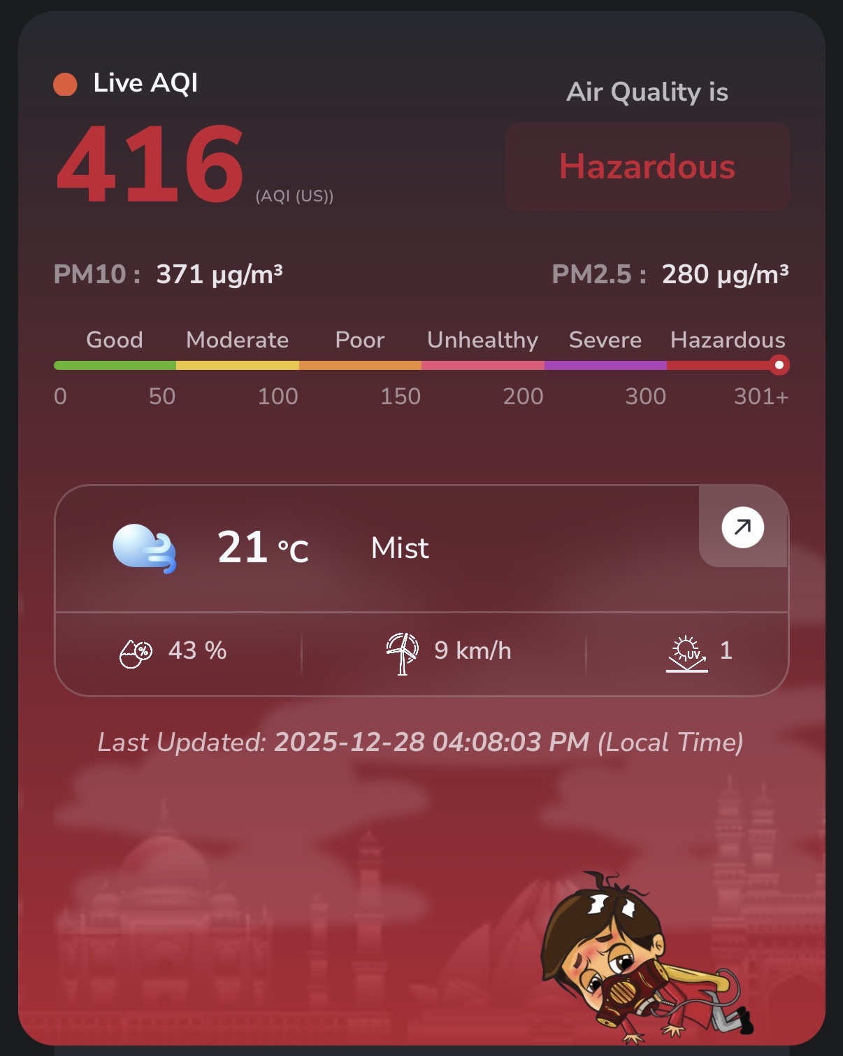 नई दिल्ली / Delhi-NCR - आज Delhi-NCR में वायु प्रदूषण बेहद गंभीर स्तर पर पहुंच गया है। कई इलाकों में AQI 400 से ऊपर दर्ज किया गया, जिसे Hazardous श्रेणी में रखा जाता है। उपलब्ध रीडिंग्स के अनुसार PM10 ~ 371 µg/m³ और PM2.5 ~ 280 µg/m³ तक दर्ज हुए हैं—जो WHO और राष्ट्रीय मानकों से कई गुना अधिक हैं।
