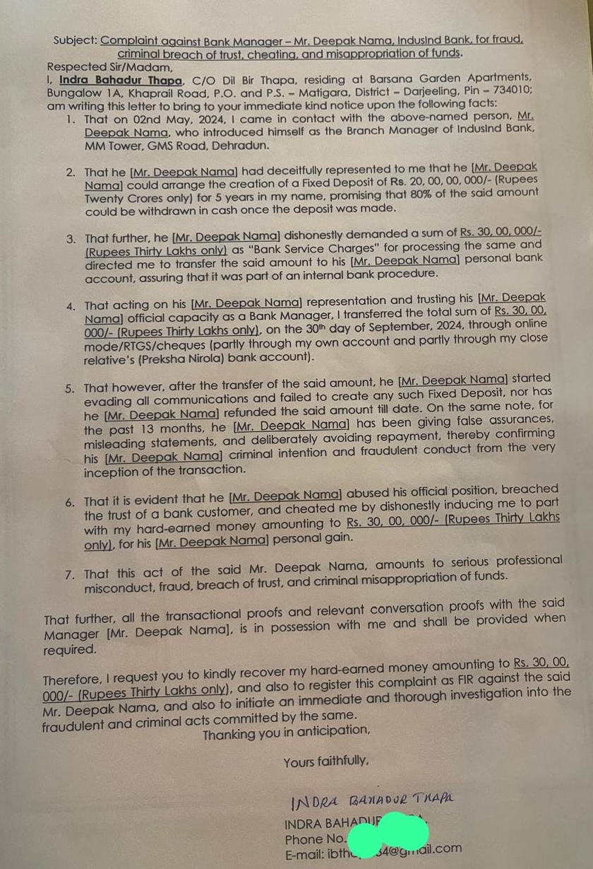 देहरादून स्थित इंडसइंड बैंक (MM Tower, GMS Road) के एक कथित ब्रांच मैनेजर दीपक कुमार नामा पर 30 लाख रुपये की धोखाधड़ी करने का गंभीर आरोप लगाया गया है। दार्जिलिंग निवासी इंद्र बहादुर थापा ने औपचारिक शिकायत दर्ज कराते हुए बताया कि बैंक अधिकारी ने स्वयं को मैनेजर बताकर फिक्स्ड डिपॉज़िट के नाम पर उन्हें बड़े पैमाने पर ठगा।